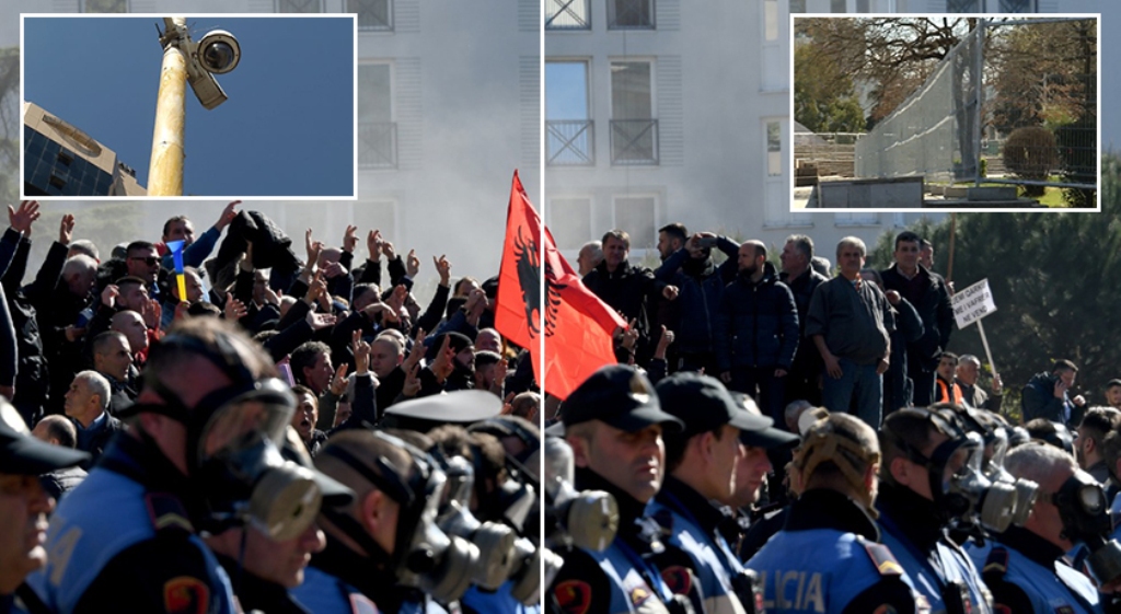 Nga oborri i Kryeministrisë është hequr kërpudha e dëmtuar nga protesta e 16 shkurtit dhe është përforcuar rrethimi i ndriçuesit tek hyrja selisë së qeverisë. Ndërsa për të shmangur ngjitjen e protestuesve siç ndodhi më 16 shkurt kur u këputën megafonët e policisë, shtyllat ku janë vendosur kamerat e sigurisë janë lyer me graso.