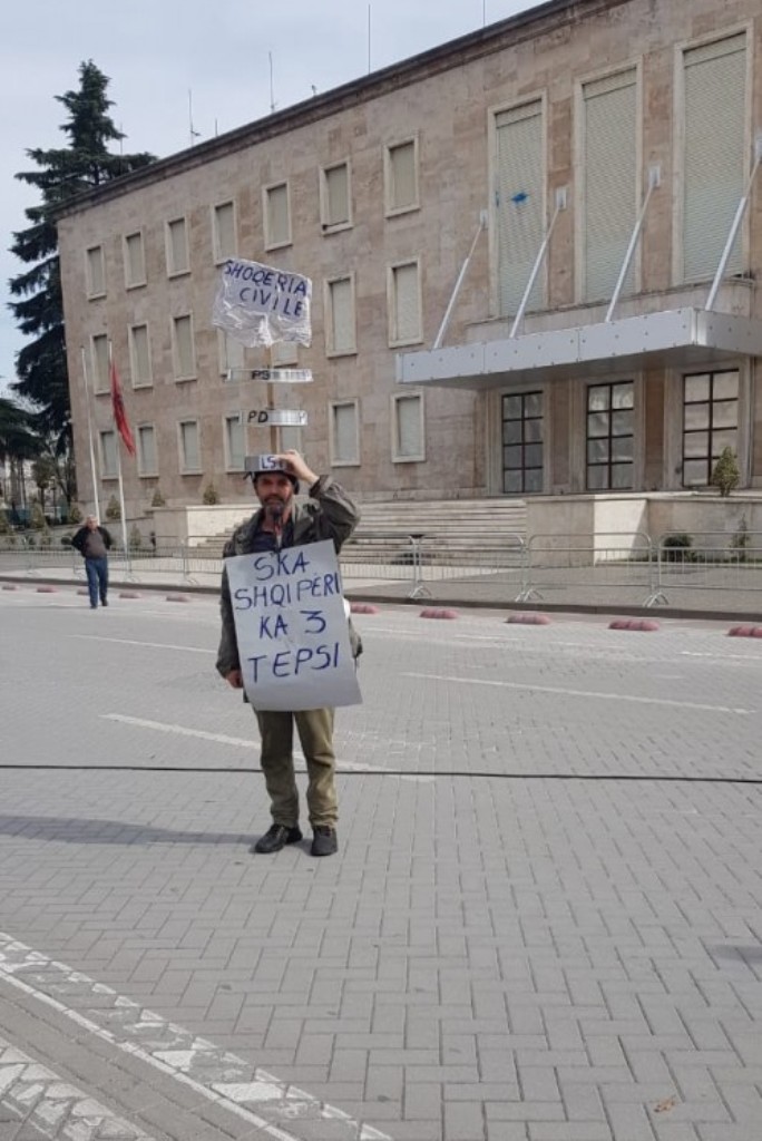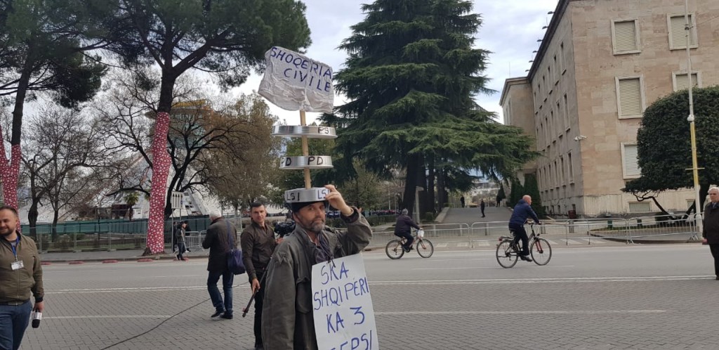 “Shoqëria Civile: PS, PD, LSI. S’ka Shqipëri, ka 3 tepsi”, shkruhet në pankartën e protestuesit.