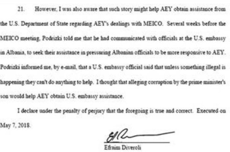 Unë mendova që trillimi i korrupsionit nga djali i Kryeministrit do të ndihmonte AEY të merrte mbështetje nga ambasada. Deklaroj nën rrezikun e dënimit për mashtrim që deklaratat e mësipërme janë të vërteta dhe të sakta. Firmosur në 7 maj, 2018.