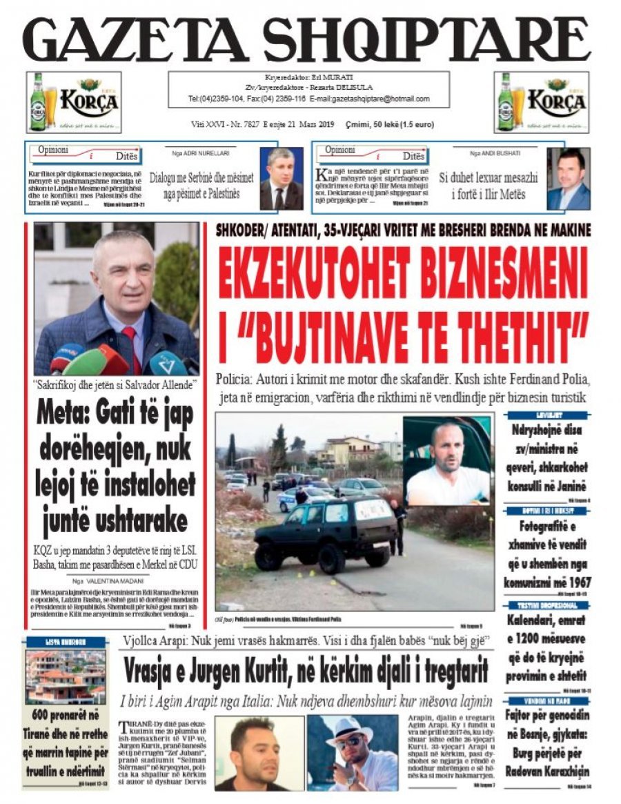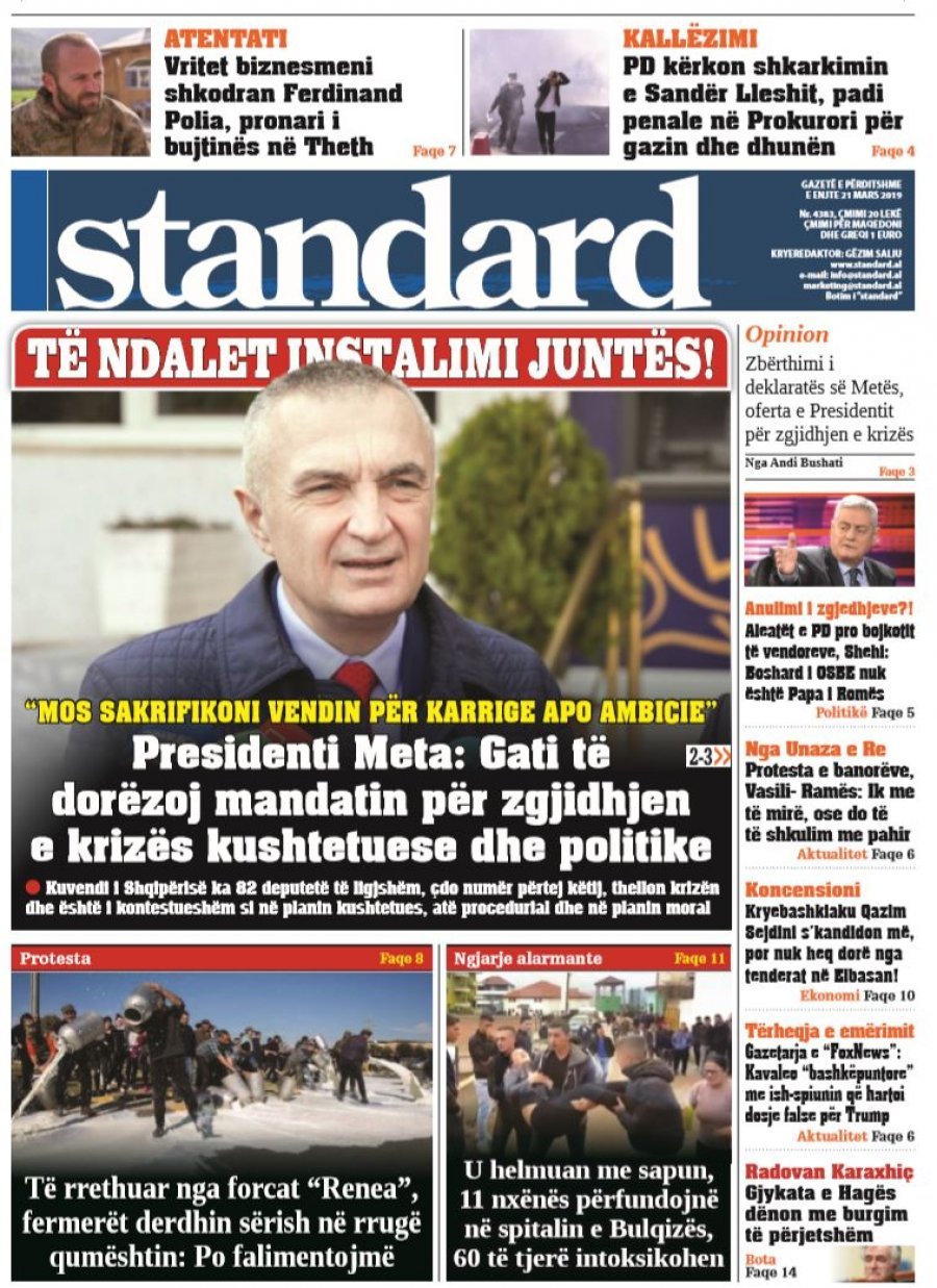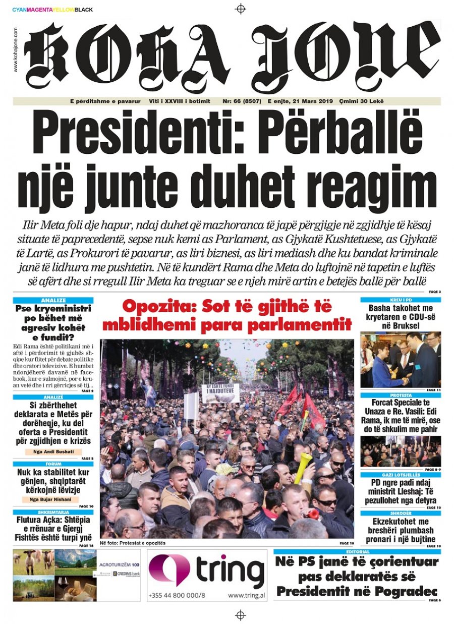 Të nderuar lexues, kjo është një pasqyrë e faqeve të para të disa prej gazetave kryesore, për ditën e enjte 21 mars 2019.