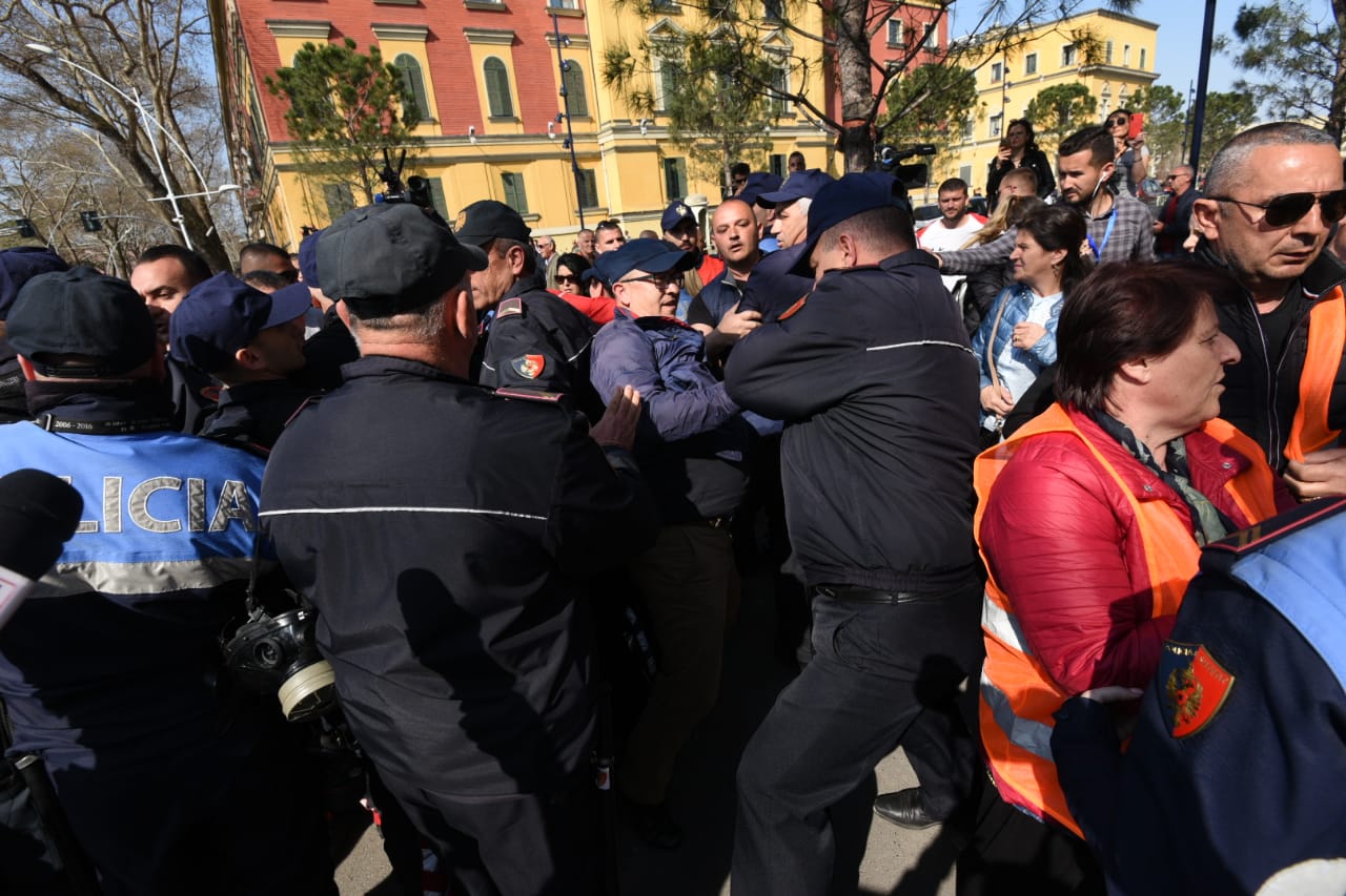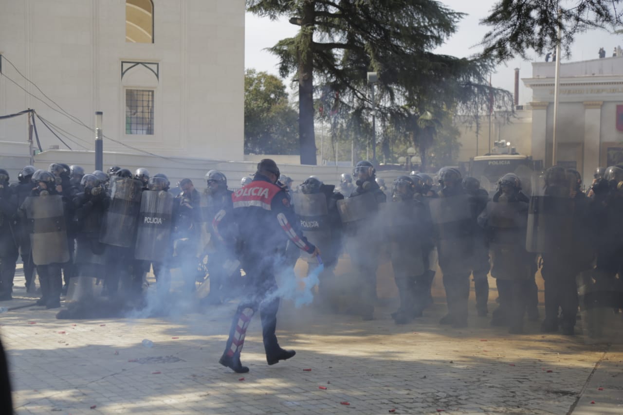 Gjatë protestës simpatizantët e opozitës kanë thirrur në kor “Rama ik!”, si dhe kanë hedhur shashka drejt policisë, ku dhe janë shtyrë mes tyre duke tentuar të depërtojnë në Parlament.