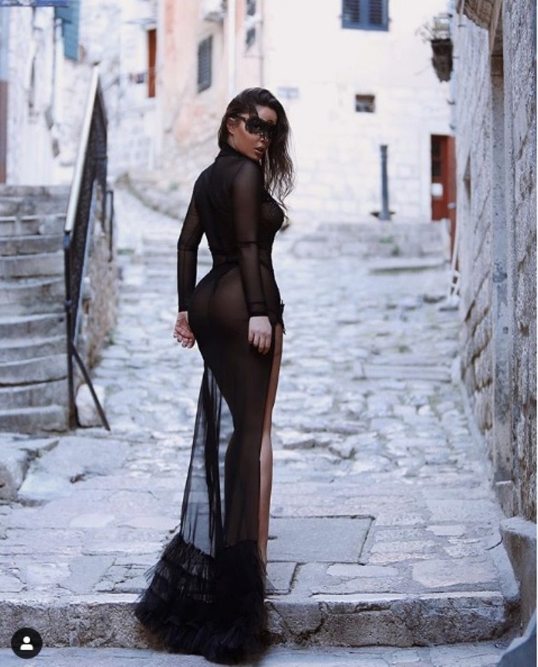 Ajo ka pozuar e veshur me një fustan të zi transparent, pa reçipeta, duke nxjerr në pah hiret e saj.