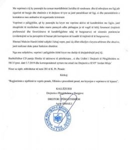 “Drejtoria e Përgjithshme e Burgjevee ka ardhur në dijeni e më pas verifikuar se drejtuesi i IEVP Jordan Misja, shtetasi Maksim Hamiti në kundërshtim flagrant me aktet ligjore e nënligjore dhe kompromentuar misionin për trajtim të barabartë dhe në përputhje me aktet rregullative të të burgosurve, ka realizuar trajtim preferencial të të burgosurit Emiljano Shullazi, ndër të tjera edhe takime me të burgosur anëtar të të njëjtit grup të akuzuar, për rrjedhojë dyshojmë se prej tij janë konsumuar elementë të veprës penale, shpërdorim i detyrës”