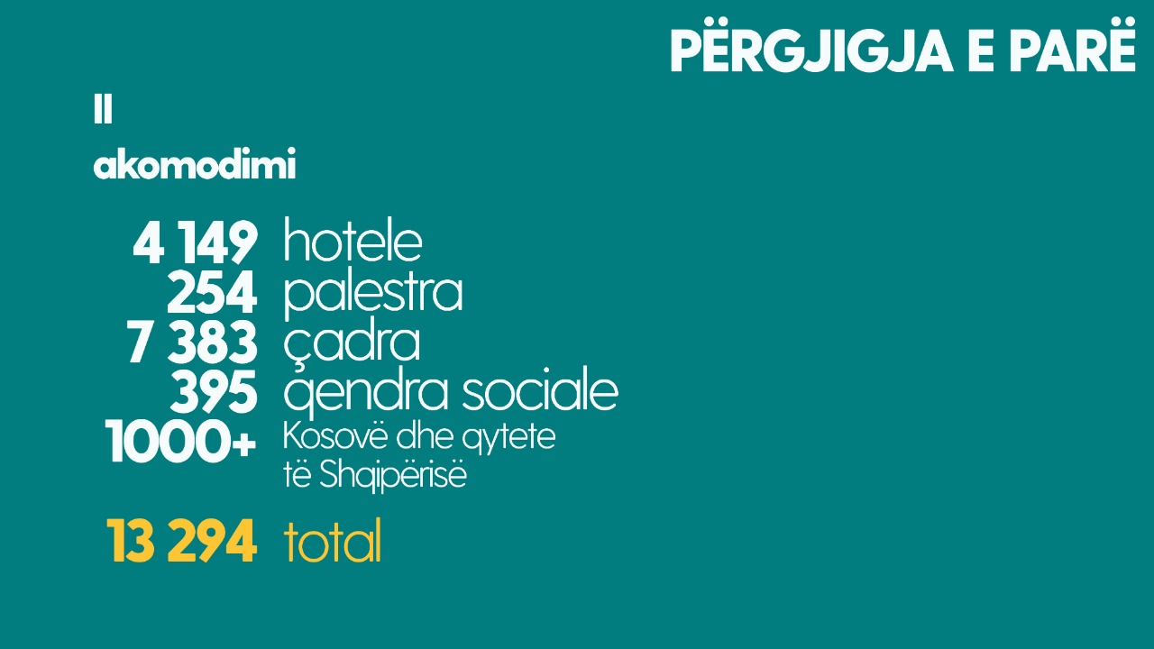 Deri më sot, ju kemi siguruar strehimin e përkohshëm rreth 13 294 qytetarëve të prekur nga tërmeti si vijon: