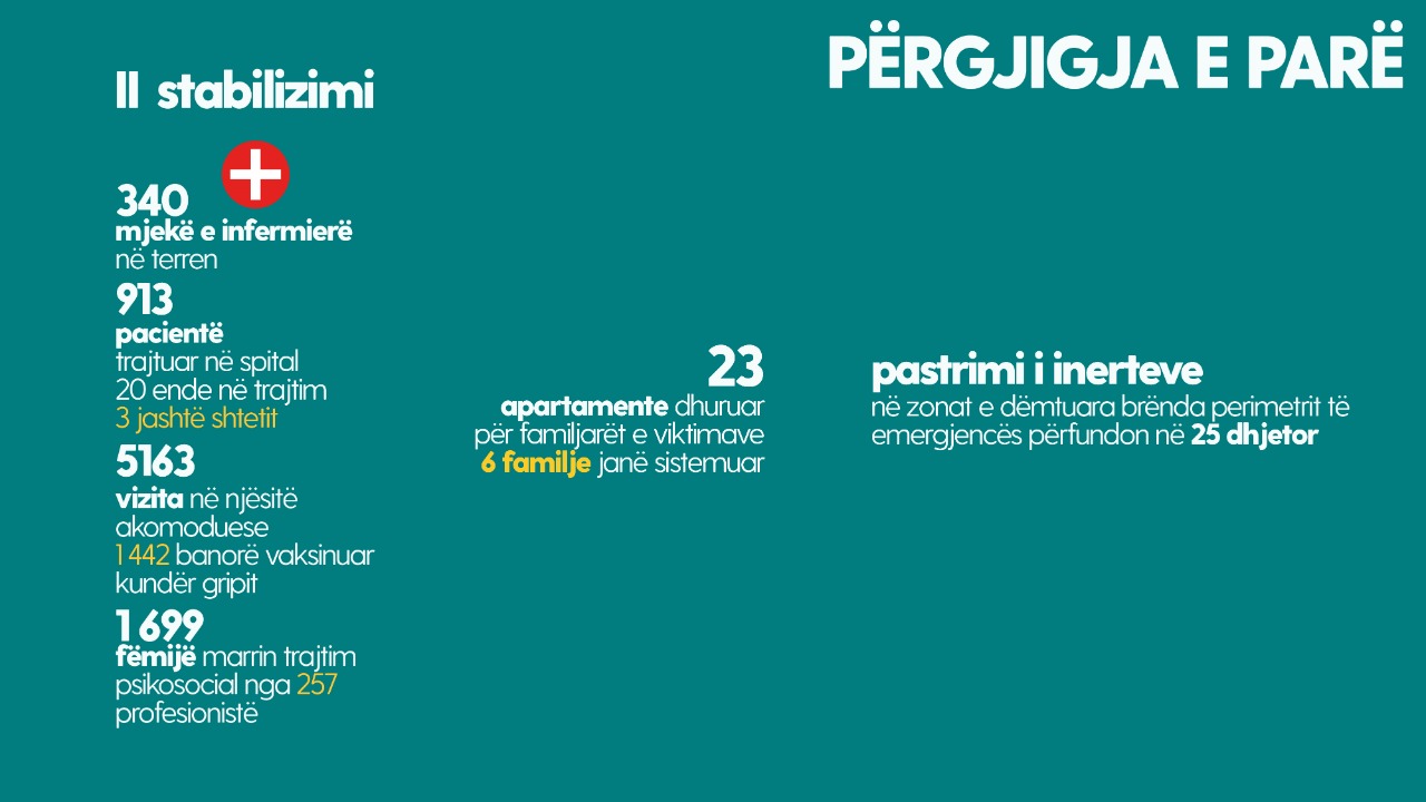 Ndërkaq, që në orët e para pas tërmetit, i gjithë zinxhiri i shërbimit shëndetësor u vu në shërbim të banorëve të dëmtuar nga tërmeti.