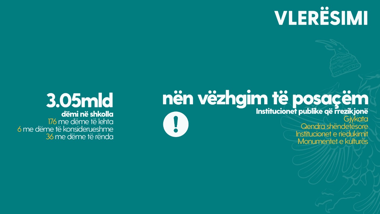 Të gjitha godinat e institucioneve që ofrojnë shërbime për publikun, si gjykatat, qendrat shëndetësore, institucionet e riedukimit, si dhe objektet e trashëgimisë kulturore, të cilat kanë dëmtime, po mbahen nën vëzhgim të posaçëm.
