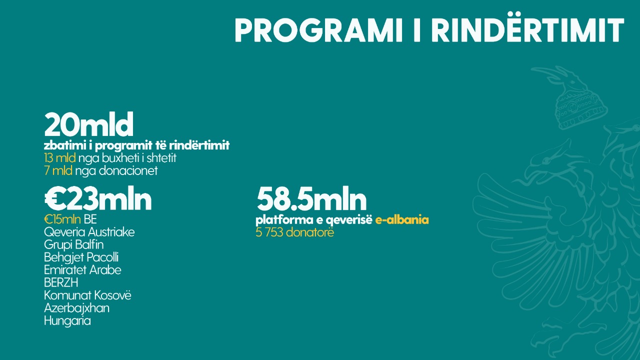 Deri më sot, janë në dispozicion 20 miliardë lekë për zbatimin e Programit të Rindërtimit, nga të cilat:13 miliardë lekë nga buxheti i shtetit dhe 7 miliardë lekë nga donacionet.