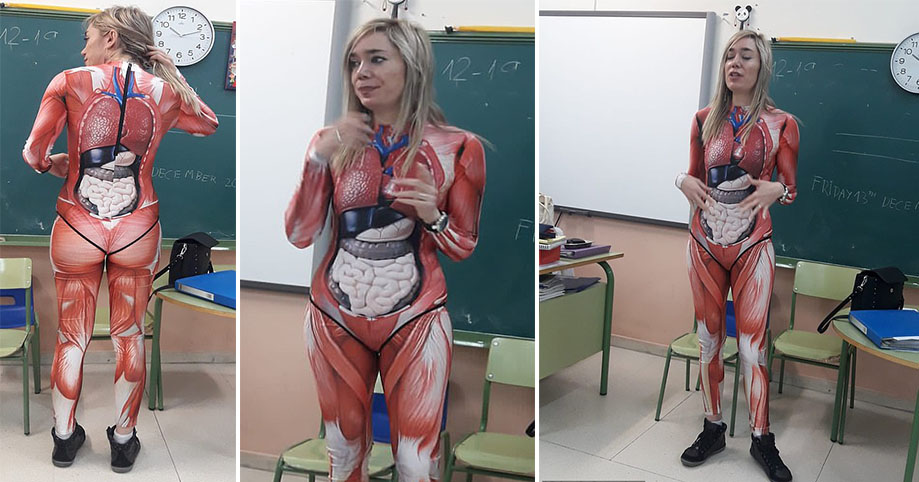 Të jesh mësuese biologjie nuk është aspak e thjeshtë. Veronika Duke, e cila punon në një shkollë në Valadolid të Spanjës u paraqit në shkollë me një kostum që e bleu në internet posaçërisht për nxënësit.