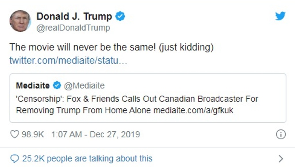 Në filmin e famshëm, Trump interpretonte vetveten. Por këtë javë, kur filmi u transmetua në televizionin kanadez CBC, skena ku ai luan mungonte.