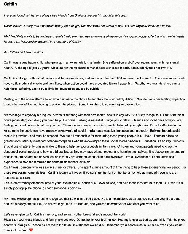 Babai i saj Pete tha: Caitlin ishte një fëmijë shumë i lumtur, i cili u rrit në një familje tejet të dashur. Ajo vuajti gjatë viteve të fundit me shëndetin e saj mendor dhe ndërroi jetë."