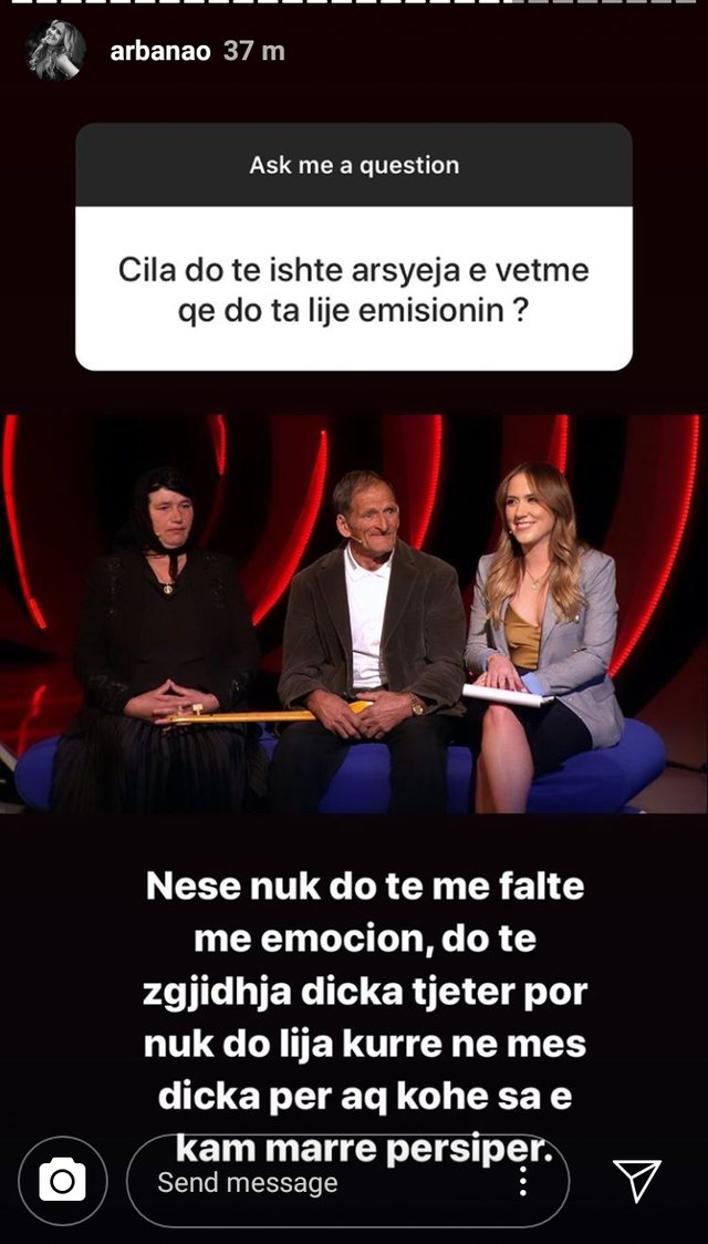 “Nëse nuk do më falte më emocion, do të zgjidhja diçka tjetër por nuk do lija kurrë ne mes diçka për aq kohë sa e kam marrë përsipër”, u përgjigj Arbana.