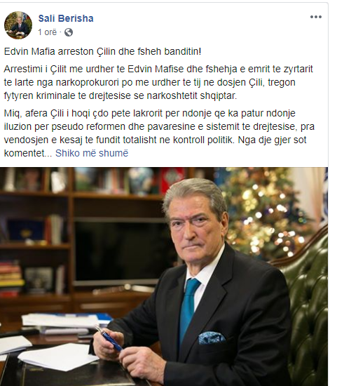“Po me urdhër të Edvin Mafisë jo vetëm lihet i lirë, por fshihet dhe mbahet sekret dhe as nuk guxohet t’i përmendet emri partnerit në krim të Henri Çilit, zyrtarit të lartë të drejtësisë, sojit të Sadusheve apo Dvoraneve të Partisë që u takua me Çilin dhe mori përsipër të kryente krimin, t’i plotësonte kërkesën atij” – pretendon Berisha përmes një reagimi në Facebook, por duke mos e përmendur as ai këtë emër.