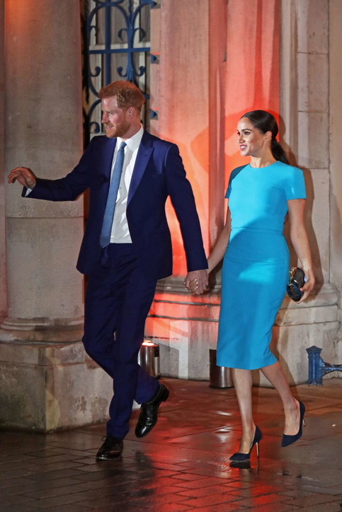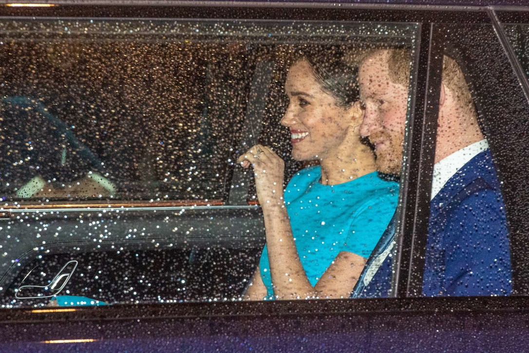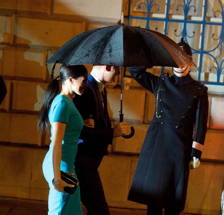 Disa lëvizje të kujdesshme, veprime dhe shikime të dashuruarish, gjithçka nën ombrellën në shi. Vëmendja e fotografëve u përqendrua mbi Meghan e cila u shfaq më elegante se kurrë me një fustan bojëqielli pas trup dhe me flokët e kapira bisht.