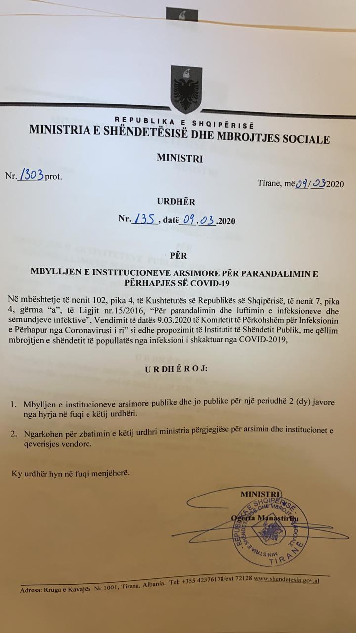 Shahini sqaron se, “Kjo për arsye frenimi të përhapjes së virusit COVID-19, i cili është shfaqur në dy raste në Shqipëri. Masa është parandaluese dhe frenuese nuk ka asnjë nevojë e arsye për panik. Po tregohemi shumë të kujdesshëm që të zvogëlojmë maksimalisht mundësinë e përhapjes së këtij virusi”.