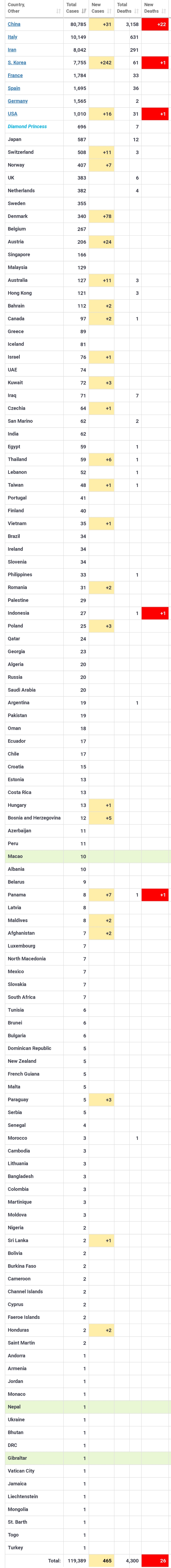 Numrin më të madh e shënoi Kina me 80 785 të prekur ndër të cilët 3 158 vdiqën, 22 vetëm 24 orët e fundit. Sakaq në Kinë janë ulut shumë rastet e të prekurve, 24 orët e fundit raportohen 31 raste të reja.