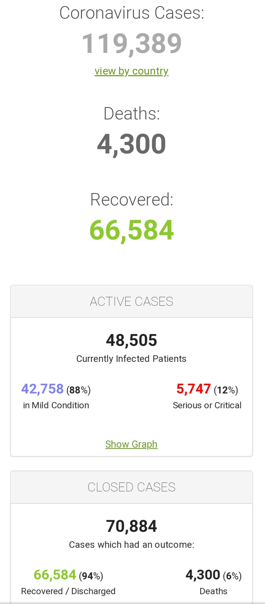 Të dhënat e minutës së fundit që raporton Organizata Botërore e Shëndetësisë evidentojnë se janë 119 389 njerë të prekur nga koronavirusi në të gjithë botën që nga fundi i dhjetorit 2019 kur epidemia nisi me rastet e para në Wuhan të Kinës.