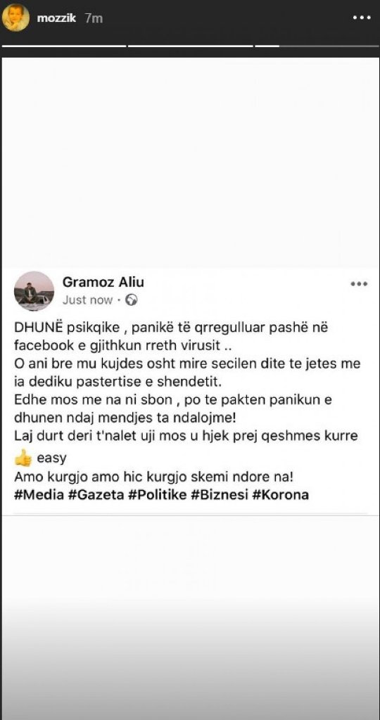 “Dhunë psiqike, panik të çrregulluar pashë në Facebook e gjithkund rreth virusit. Kujdesi është mirë për secilën ditë të jetës, që t’ ia dedikojmë pastërtisë së shëndetit. Edhe të mos na bëhet vonë s’bën , po të paktën panikun e dhunën ndaj mendjes ta ndalojmë! Laj duart deri sa të ndalet uji mos i hiq, ngadalë ama kurrgjë, hiç kurrgjë s’kemi në dorë”, shkruan Mozzik./b.l/noa.al/