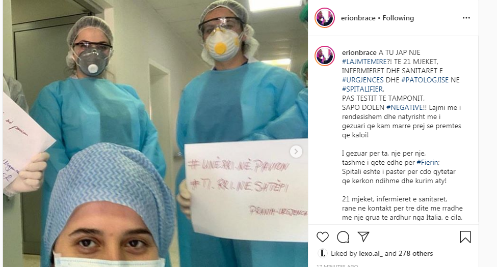Nëpërmjet një postimi në rrjetet sociale Braçe shkruan se asnjë mjek, infermier apo sanitar sipas tij, nuk ka dalë pozitiv nga koronavirusi.
