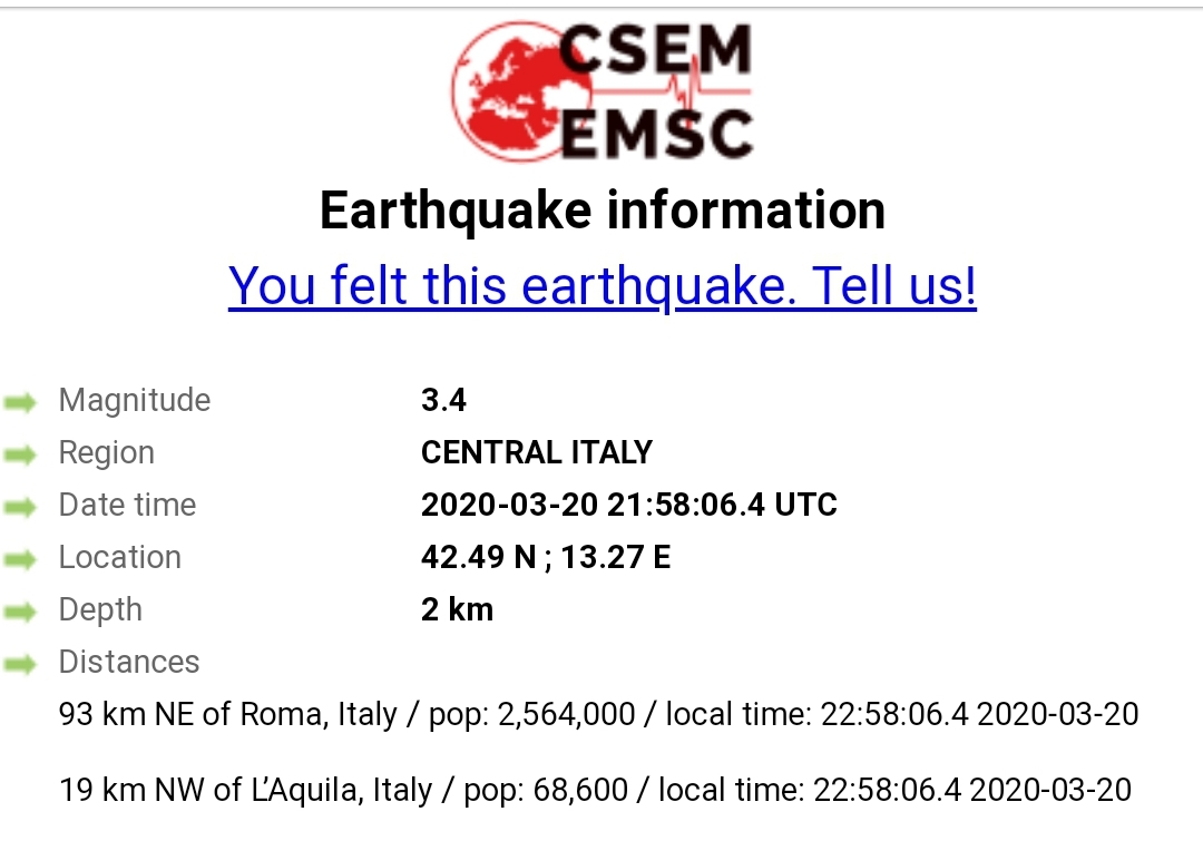 Sipas të dhënave, tërmeti u regjistrua 19 km në verilindje të Aquila dhe 93 km pranë Romës.