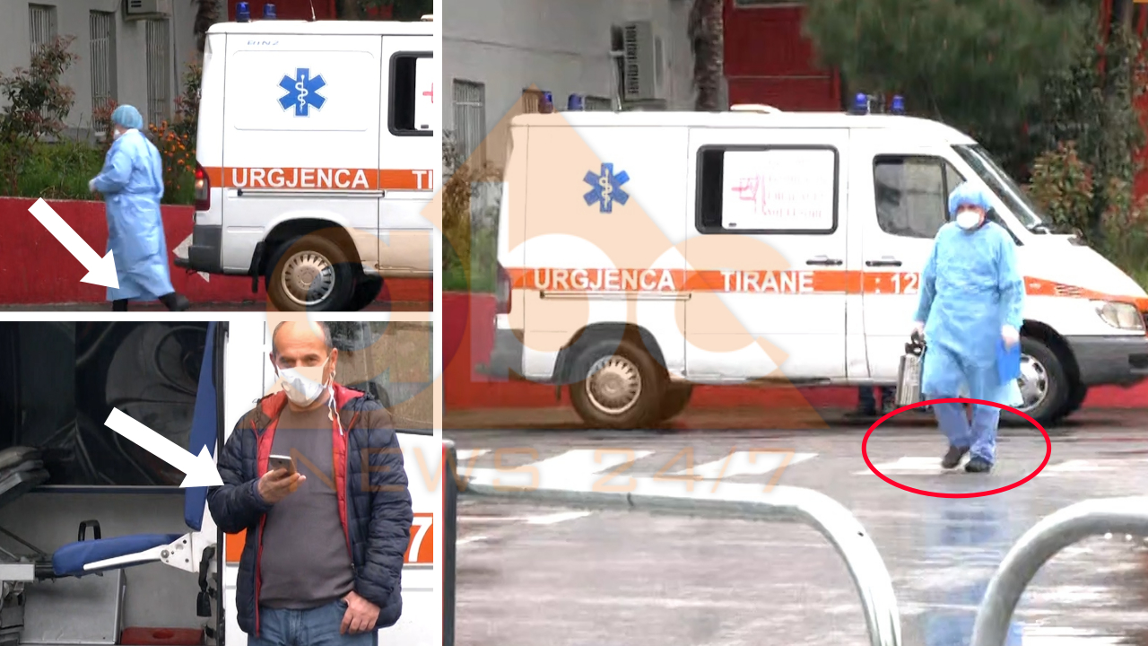 Në pamje shihet infermieri i cili ka veshur vetëm një përparëse transparente ndërkohë që nga këmbët mban të veshura këpucët si zakonisht me të cilat hyn në brendësi të ambulancës dhe më pas në ambientet e spitalit infektiv.