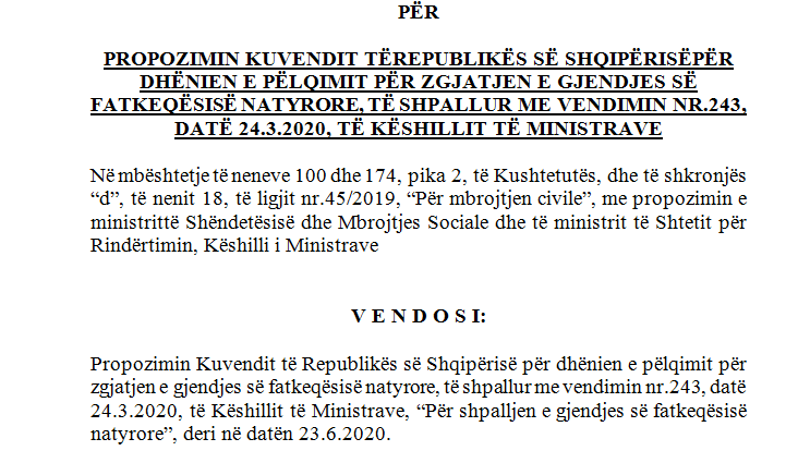 Këshilli i Ministrave ka propozuar që gjendja e fatkeqësisë natyrore të zgjatet deri në datën 23 qershor 2020.