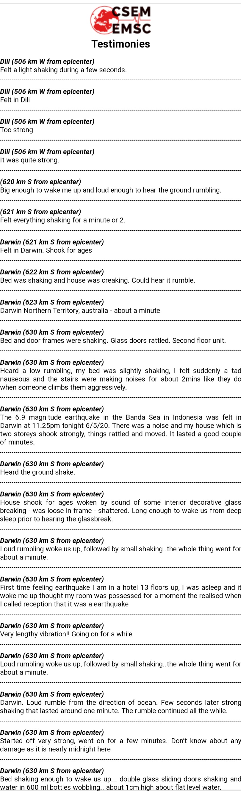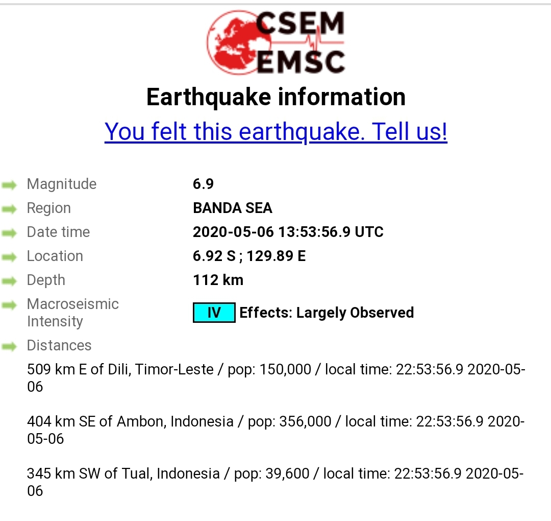 Tërmeti u lokalizua 404 km larg qyteteve Ambon dhe Tual në Indonezi dhe 509 km larg Timorit Lindor.