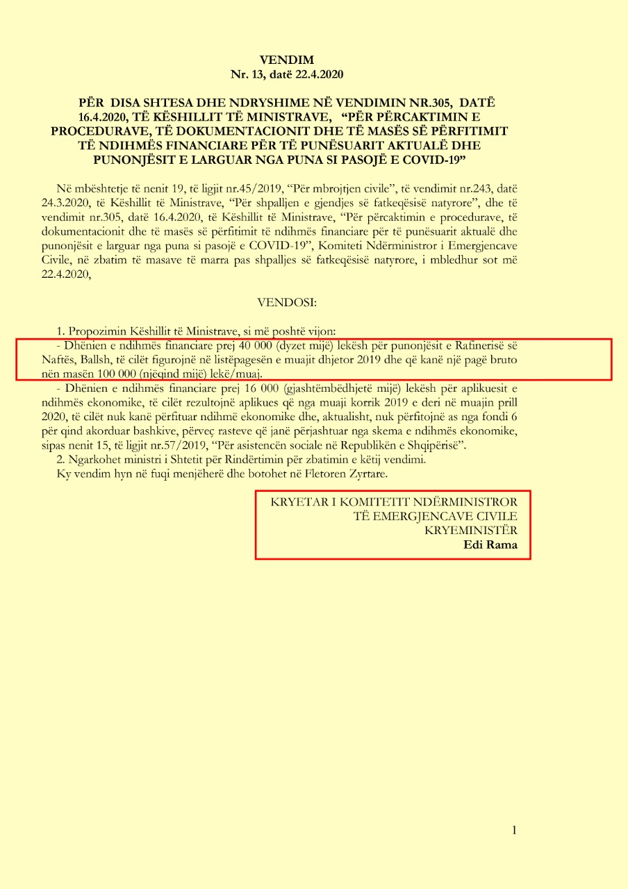 “Vendimi i datës 22 prill e thotë shprehimisht se naftëtarët e Ballshit, të gënjyer e të mashtruar për kaq muaj nga qeveria e Edi Ramës për rrogat e tyre, do të merrnin një pagesë ndihme prej 400 mijë lekësh.
