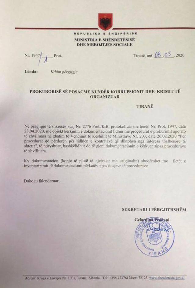 “Informojmë qytetarët se në Ministrinë e Shëndetësisë dhe Mbrojtjes Sociale, më datë 8 Maj 2020 është firmosur shkresa përcjellëse (faksimile bashkëlidhur) me dokumentacionin e të gjitha procedurave të kërkuara nga organet e drejtësisë”, shkruhet në reagim.