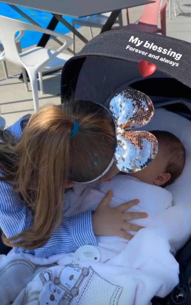 Miriami ka ndarë një fotografi të adhurueshme të dy fëmijëve të saj, teksa vajza Ameli puth vëllanë e vogël, Duam i cili qëndron në karrocë.