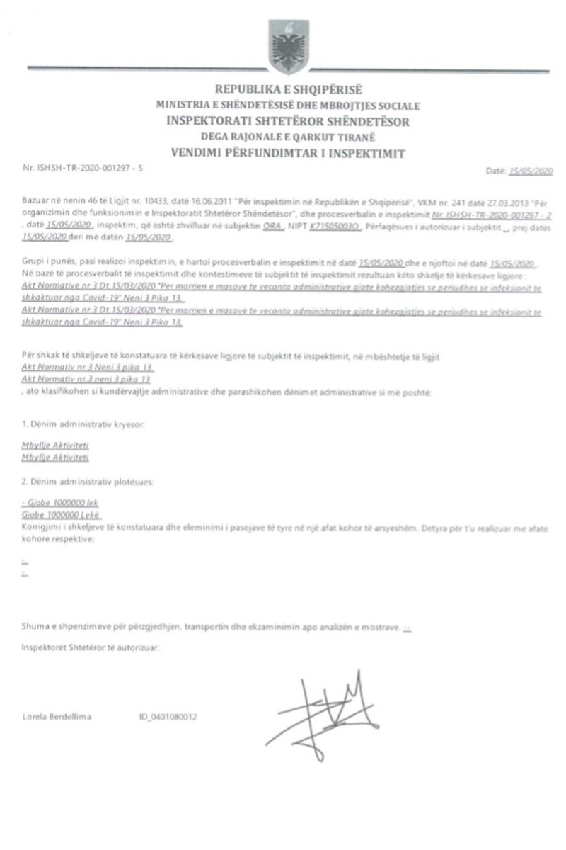 “Si rast përsëritjeje e kësaj shkeljeje, ISHSH dhe AMA kërkon mbylljen e sinjalit të këtij televizioni dhe ndalimit të funksionimit të pajisjeve, pas marrjes së vendimit nga ministria përgjegjëse për shëndetësinë dhe zbatohet nga organi kompetent, bazuar në nenin përkatës të Aktit Normativ Nr. 3 të vitit 2020”, thuhet në letrën dërguar institucionit mediatik. k.k/noa.al/