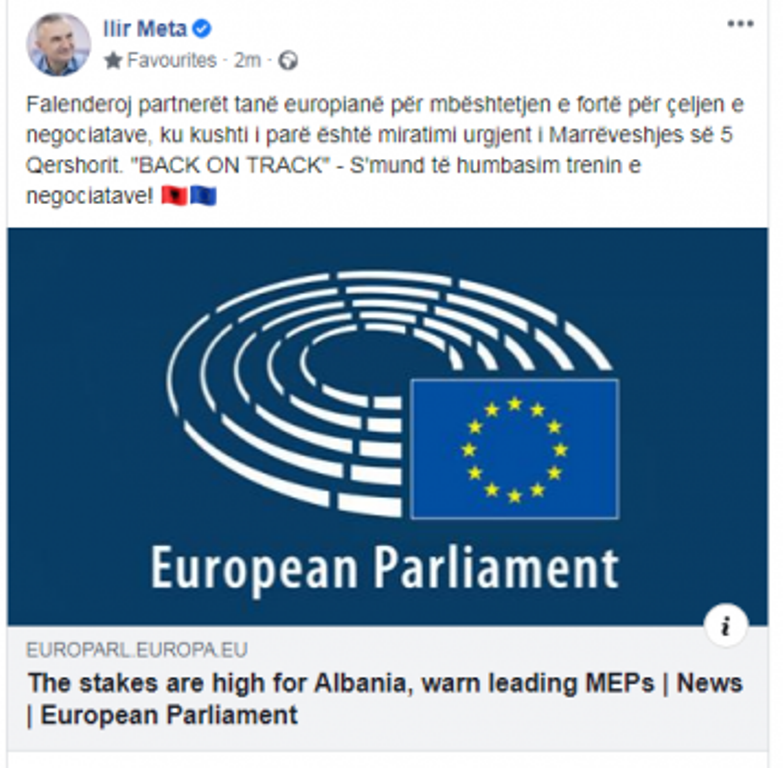 Presidenti i Republikës Ilir Meta ka reaguar pas deklaratës së tre eurodeputetëve të publikuar nga PE, për çështjen e marrëveshjes së 5 qershorit dhe integrimin.