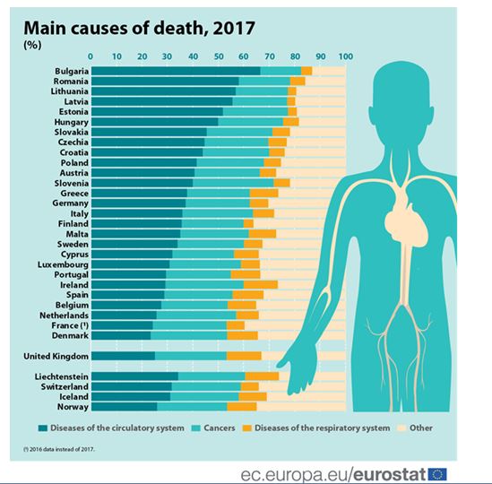 Ndër shtetet anëtare të BE-së, përqindja më e lartë e vdekjeve për shkak të sëmundjeve të sistemit të qarkullimit të gjakut është vërejtur në Bullgari (66%) dhe më e ulëta në Danimarkë (23%), ndërsa përqindja më e lartë e vdekjeve për shkak të kancerit është vërejtur në Slloveni ( 32%) dhe pjesa më e ulët në Bullgari (16%).