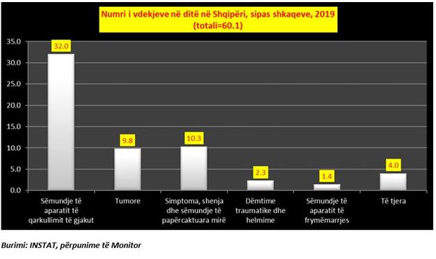 Vdekjet nga grupsëmundja “Tumore” zënë 16,4 % të vdekjeve gjithsej, duke u renditur si grupi i dytë kryesor referuar numrit të vdekjeve të shkaktuara. Niveli i vdekshmërisë për këtë grup-sëmundje është 12,7 për 10 mijë banorë dhe ka një rritje prej 2,0 %,krahasuar me vitin 2016. Në grupin “Tumore” përqindjen më të lartë e zë nëngrupi “Tumore të aparatit të frymëmarrjes”, me 33.5 %, shkruan ‘monitor’.