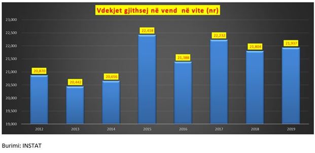 Në vitin 2017 është shënuar dhe niveli më i lartë i vdekjeve në vend. Të dhënat e tjera të INSTAT bëjnë të ditur se ky tregues u ul në 2019-n. Gjithsej në vitin 2017 humbën jetën në vend rreth 22.3 mijë persona, ndërsa në 2019-n rreth 21.9 mijë, duke bërë që norma e vdekshmërisë për 2019-n të zbresë në 768,6 vdekje për 100 mijë banorë (nga 744 në 2017-n).