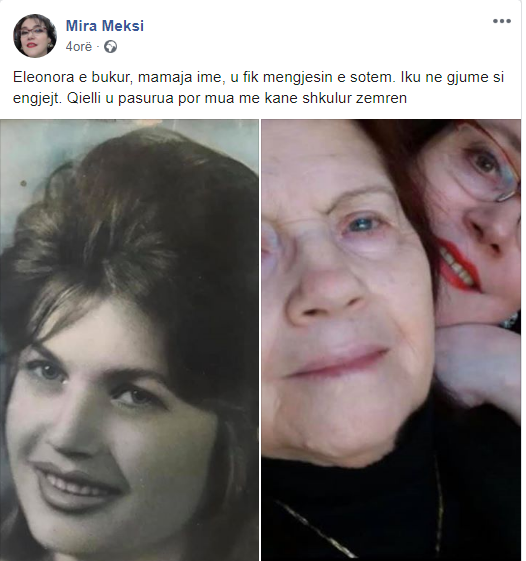 “Eleonora e bukur, mamaja ime, u fik nëngjesin e sotëm. Iku në gjumë si engjëjt. Qielli u pasurua por mua më kanë shkulur zemrën”, – shkroi Mira në postimin e sotëm, duke ndarë dhimbjen e madhe me miqtë, kolegët dhe dashamirësit.