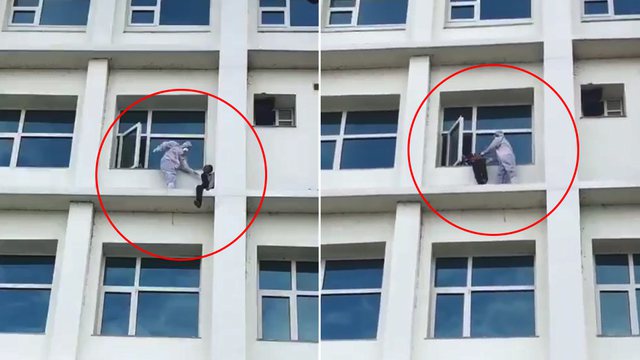 Në rrjetet sociale shfaqet mjekja e veshur me kostumin e plotë kundër Covid-19 që del nga dritarja e dhomës dhe përpiqet të bindë pacientin e shqetësuar me Covid-19 që të mos hidhet në tokë.