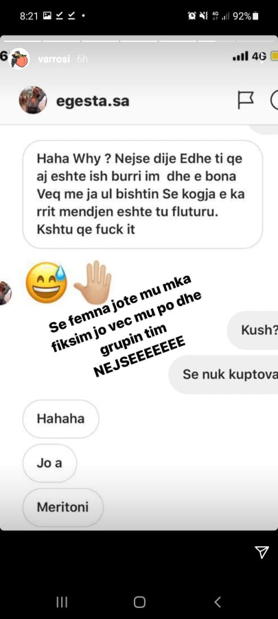 “Se femna jote mu m’ka fiksim, jo veç mu po dhe grupin tim! Nejseeee”, ka shkruar Varrosi përkrah bisedës me ish të dashurën e Meritonit.