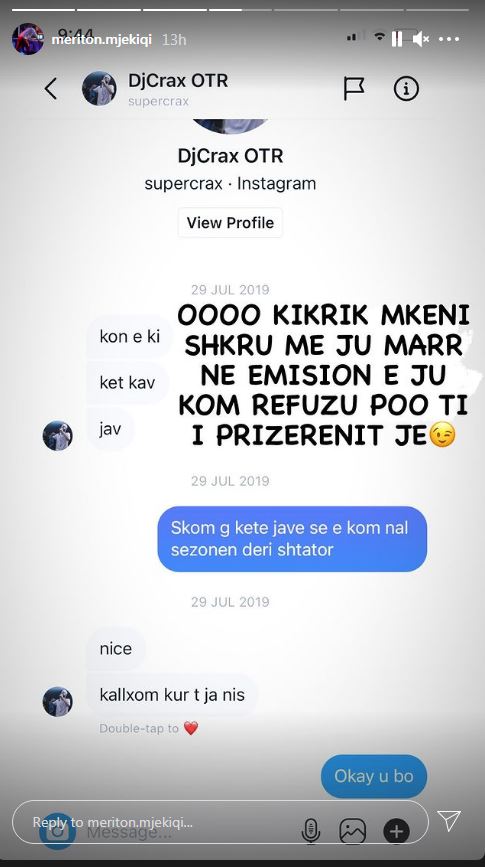 “Ooo kikrik më keni shkruar me ju marr në emision e ju kom refuzu po ti i prizrenit je”-shkruan Meritoni.