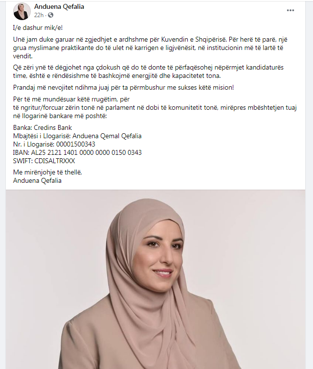 “I/e dashur mik/e! Unë jam duke garuar në zgjedhjet e ardhshme për Kuvendin e Shqipërisë. Për herë të parë, një grua myslimane praktikante do të ulet në karrigen e ligjvënësit, në institucionin më të lartë të vendit.