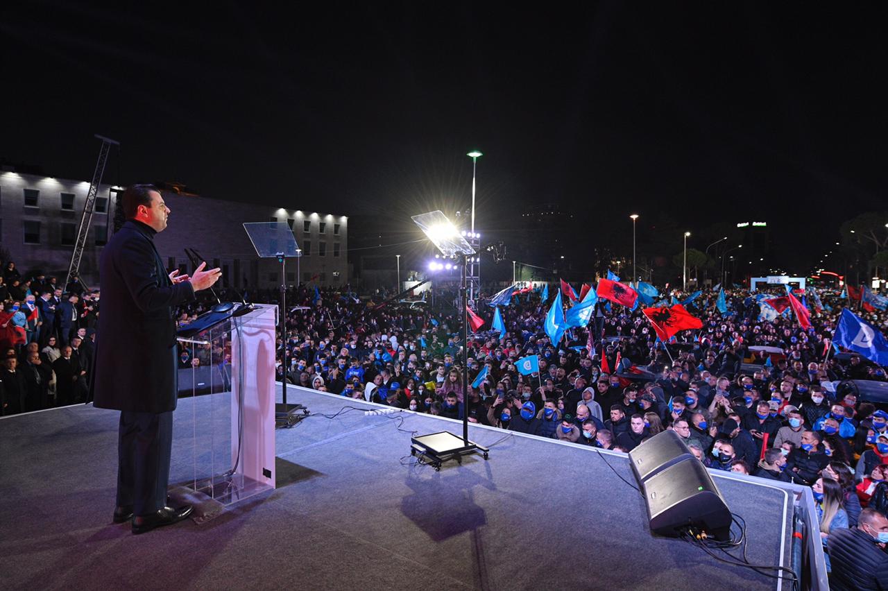 "Mirëmbrëma Shqipëri! Përshëndetje ju motra dhe vëllezër që keni mbushur këtë shesh. Ju motra dhe vëllezër shqiptar kudo që ndodheni në këtë mbrëmje hyjnore të bashkimit tonë për ndryshim me të cilin do të fitojë Shqipëria dhe çdo shqiptar. Mirëmbrëma kandidatëve të Partisë Demokratike të Shqipërisë, aleatëve tanë të koalicioni, ekipit tonë të fitores dhe ndryshimit për çdo shqiptar. Edhe 31 ditë. Vetëm 31 ditë për të nisur së bashku rrugën e ndryshimit të Shqipërisë, rrugën e zhvillimit, të punësimit, të mirëqenies dhe të integrimit të saj në familjen tonë europiane. Jemi këtu të gjithë bashkë dhe jam mes jush sepse ju keni marrë një vendim shumë të rëndësishëm ti japim së bashku fund tranzicionit shqiptar dhe të hapim një faqe të re të historisë moderne dhe europiane të Shqipërisë. Të mundësojmë që më të mirët, më të ndershmit të drejtojnë fatet e vendit sepse familja jonë e madhe Shqipëria ka nevojë sot më shumë se kurrë për punë, nder dhe ndryshim rrënjësorë. Sepse ne sot më shumë se kurrë duhet të mbrojmë e të vendosim në vendin e duhur krenarinë tonë të kahershme kombëtare si shqiptarë, sepse duhet të ndalojmë një orë e më parë këtë varfërim dhe këtë zbrazje që po i ndodh so Shqipërisë, sepse nënat dhe motrat tona nuk duhet të kursen më nga dhimbja që shkakton braktisja e vatrave të familjes, që si pasojë sjell braktisjen e madhe që ka pllakosur sot mbarë vendin, sepse Shqipëria gjithmonë ka qenë kryelartë në shekujt e trazuar të historisë së vet. Dhe ne jemi sot këtu si përgjigje e thirrjes së saj për të ndalur dorën që zhvat pasuritë e kombit, dorën që vret shpresën e shqiptarëve dhe mendjen e errët që kërkon të mbjellë frikën dhe dyshimin në zemrat e bashkatdhetarëve tanë.