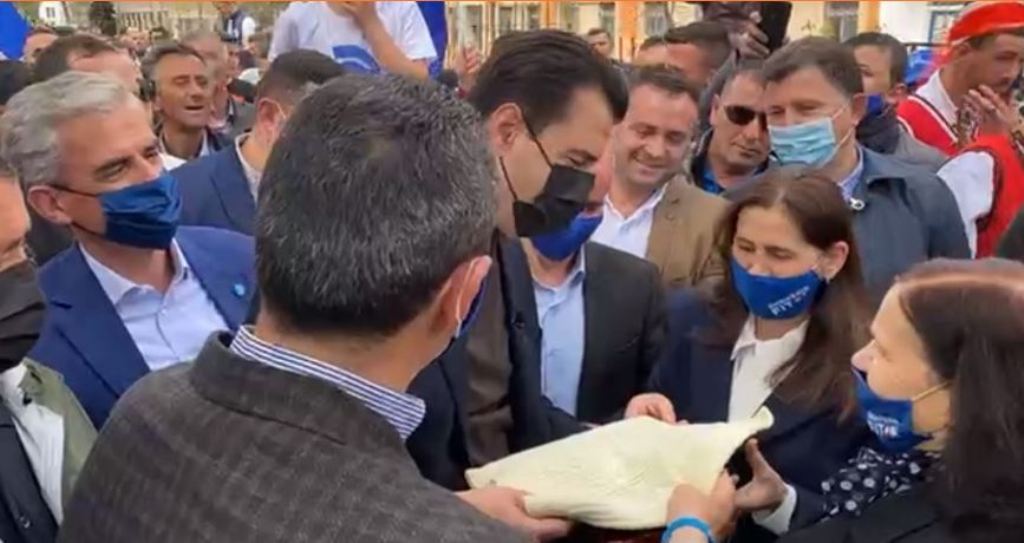 Gjatë vizitës Basha vendosi lule edhe në bustin e poetit të vrarë, Havzi Nelës. Gjatë këtij momenti, Basha ka marrë një dhuratë nga bashkëshortja e Havzi Nelës. Lavdie Nela i dha kryedemokratit e çorape leshi.