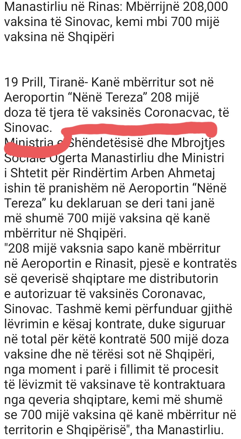 Më 19 prill kur erdhën edhe 208 mijë doza vaksine, ministria e Shëndetësisë njoftoi mediat se kishin ardhur vaksinat CoronaVac të kompanisë kineze Sinovac.