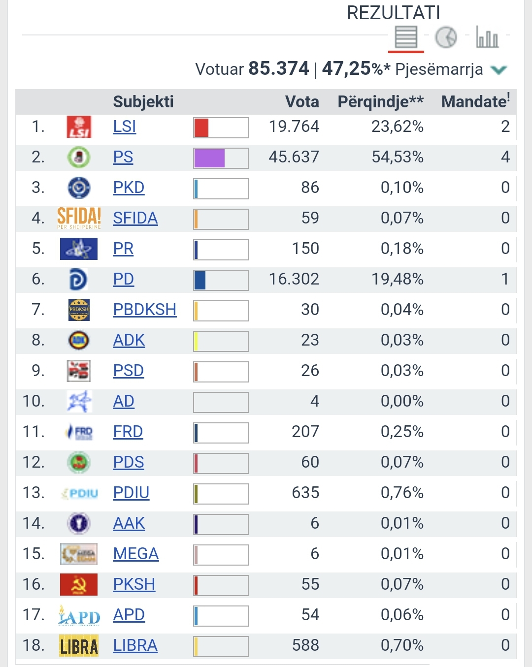 Në 2017, PS mori 4 mandate, LSI 2 dhe PD 1 deputet. Në infografikë shihni më në detaje rezultatet.