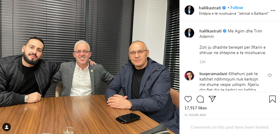 “Me Agim dhe Trim Ademin. Zoti ju dhëntë bereqet për iftarin e shtruar në Shtëpinë e të Moshuarve”, ka shkruar Kastrati.