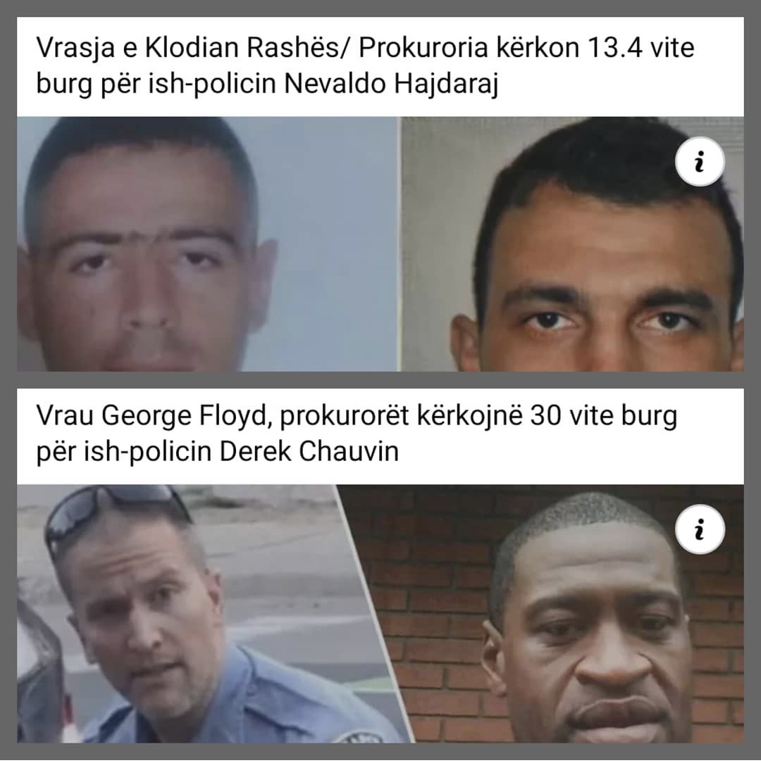 Ndërsa në Tiranë, prokuroria çmoi se Nevaldo Hajdaraj duhet të dënohet dy herë më pakmse Floyd. Pretenca erdhi pak orë para se në media të dilte video që tregon momentet si Nevaldo e ndjek dhe e qëllon me plumb pas shpine të riun Klodian Rasha duke i marrë jetën. Kjo video ishte që në orët e para pas krimit në duart e Policisë dhe hetuesve por nuk ishte bërë publike deri sot.