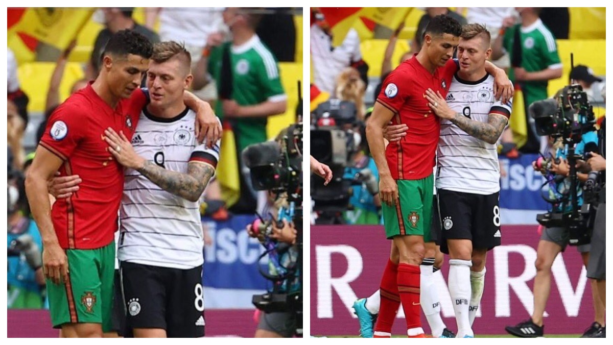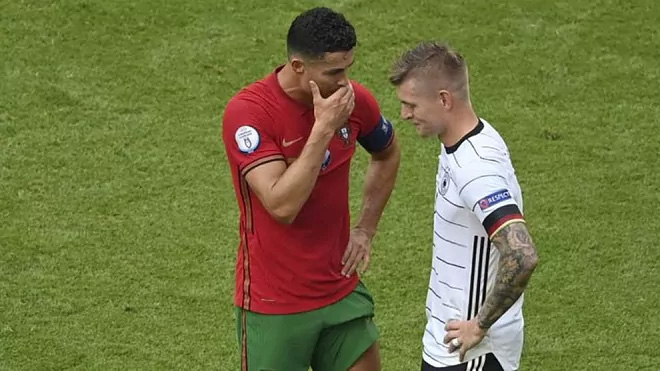 Ishte një nga imazhet e lojës së shkëlqyeshme, deri më tani, të “Euro 2020”. Me fishkëllimën përfundimtare të Gjermani-Portugali, kamerat shkuan drejt Cristiano Ronaldos dhe Toni Kroos, të cilët deri vonë ishin shokë skuadre te Real Madridi. Në javën e lamtumirës së Sergio Ramos me Real Madridin kishte shumë spekulime për atë bisedë të shkurtër mes të dyve, por gjithë misterin e largon vetë numri 8 gjerman: