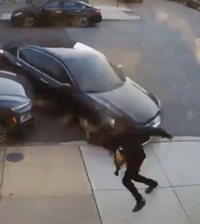 Burri në ato momente nis duke bërtitur, ndërsa gruaja shfaqet duke dalë nga makina. Pas pak sekondash, ajo rikthehet sërish brenda në makinë dhe tenton për herë të tretë që ta përplasë atë.