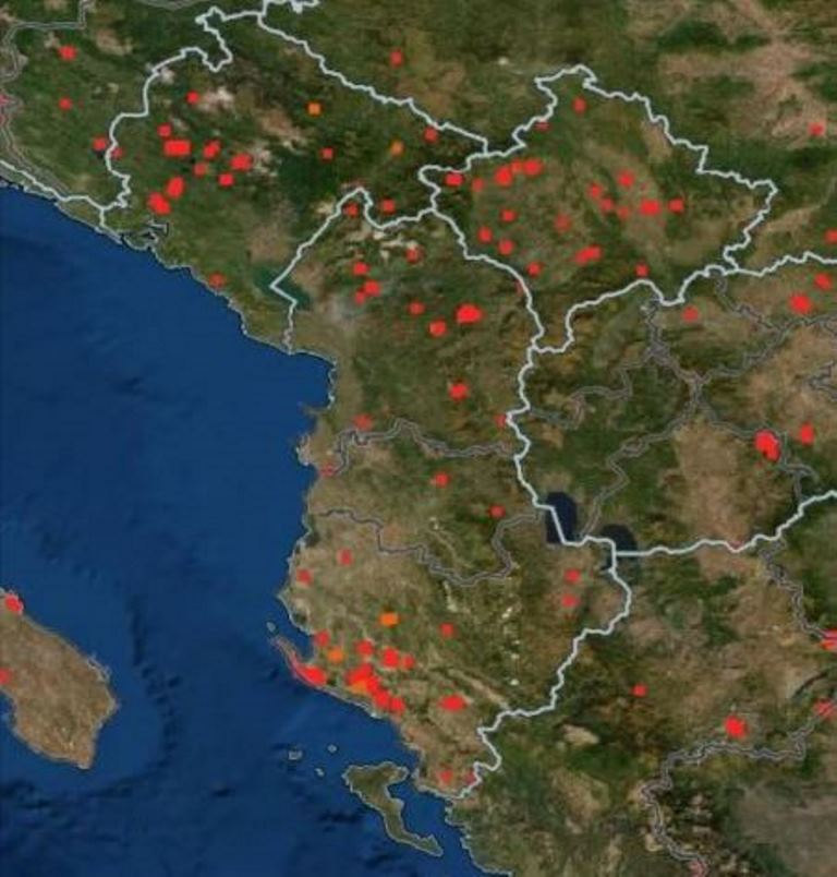 Po ashtu në hartë tregohen se një pjesë e madhe e rajonit, si Maqedonia, Kosovë apo Mali i Zi. Ndërkohë edhe në Greqi shënjohen vatra të mëdha zjarri.