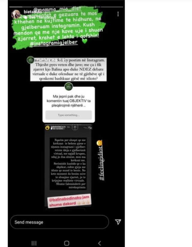 Që momentet e gëzuara të mos kthehen në kujtime të hidhura, ne gjelbëruam Instagramin. Kush mendon që me një kovë ujë i shuan zjarret, krahët e lehta i qofshin”, i është përgjigjur Bieta.