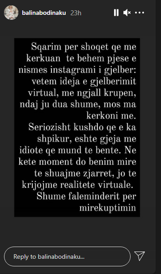 “Sqarim për shoqet që më kërkuan të bëhem pjesë e nismës Instagrami i gjelbër. Vetëm Ideja e gjelbërimit virtual, më ngjall krupën, ju dua shumë, mos ma kërkoni më. Seriozisht kushdo që e ka shpikur, është gjëja më idiote që mund të bënte. Në këtë moment do bënim mirë të shuajmë zjarret, jo të krijojmë realitete virtuale. Shumë faleminderit për mirëkuptimin”, ka shkruar Balina në reagimin e saj.